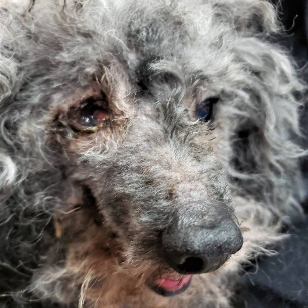 保護後、伸び放題の毛を刈ったところ、右目がつぶれていることが判明。