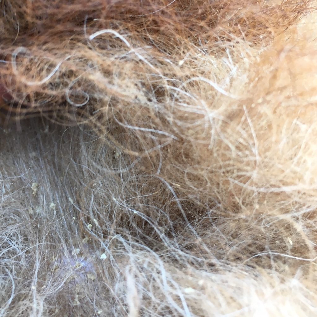 結果、毛は伸び放題、大量の毛玉とフケだらけになっていました。もちろん、ニオイもかなりついておりました。